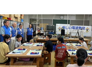 電波教室ではおもしろ電波教室のDVDを視聴後、身近にある電波、技適マークについて説明を行い、実験機材を使って目には見えない電波を確認する体験をしていただきました。その後、FMラジオの組み立てを行いました。