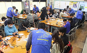 初めに、テレビ放送や新聞で取り上げられていたニュースから、身近な電波利用を探し、説明を行いました。その後、FMラジオ作りを親子で協力、工夫しながらハンダ付けを行い、全員がラジオを完成させました。室内を移動したり、ラジオの向きを変えたり、簡易な外部アンテナを接続したりして、親子で熱心に上手なラジオ受信を体験しました。
