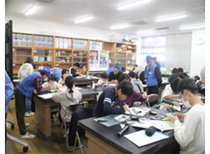 教室では、「無線で交信してみよう」のコーナーにおいて、災害時等における無線機利用の概要についての説明をした後に、デジタル簡易無線(登録局)及び、デジタル小電力コミュニティ無線を使用して体験運用を行ないました。