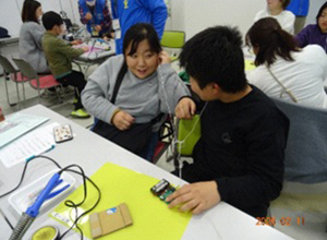 FMラジオキットの工作では、慣れるにつれて半田ごてを持つ手も直ぐに一人前になりました。イヤホンからラジオの音が聴こえた瞬間の母子の歓声に我々推進員も感動しました。参加した15組のFMラジオが無事完成しました!!!