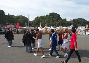 「わらじ祭り」は、一つ目片足の巨人「ダンダラボウシ(ダンダラボッチ)」が村を荒らすのを、村人たちが巨大なわらじを作って見せて退散させたという伝承に由来します。祭りの最後には、畳1枚ほどの大わらじを引いて町中を練り歩き、海へ運び流して海上安全と大漁を祈願します。(志摩市観光協会ホームページより)