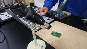 最初におもしろ電波教室DVDを視聴して、電波の基本的な事項と電波の利用にはルールを守ることが大切であることを学びました。そして、半田ごての取扱いとリード線の処理方法など諸注意を行った後、FMラジオ工作を行いました。