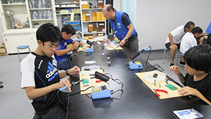 最初におもしろ電波教室DVDを視聴し、半田ごての取扱いとリード線の処理方法など諸注意を行った後、FMラジオ工作を行いました。