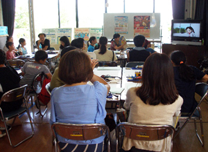 | 電波の実験の説明を真剣に聞く参加者 | おもしろ電波教室(DVD)を鑑賞中 |