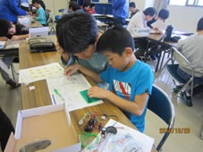 | 愛知県電波適正利用推進員協議会は、9月28日(土)名古屋市なごや小学校において小学生21名とその保護者21名を対象として電波教室を開催しました。教室では、電波に関するビデオ視聴や「ラジオの仕組みを知ろう」の説明をし、電波クイズで電波について勉強したあと、ラジオキットの製作を行いました。教材はAMラジオキットを使いました。 完成したラジオのスイッチを入れダイアルを回して、ニコッとした子と、首をかしげる子がいてとても対称的でした。今回は部品の初期不良が多く鳴らない子もいましたが、最後は全員が「聞こえた、聞こえた」と喜んでいました。 |