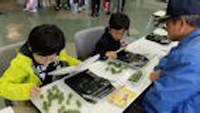 | 推進員ブースの前で | 電子ブロック組み立てに格闘する親子 |